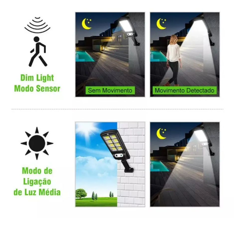 Com três modos de funcionamento — segurança, luz contínua ou brilho inteligente — o refletor se adapta ao seu dia a dia. Ele acende sozinho ao anoitecer, aumenta a potência quando alguém se aproxima e garante que sua casa esteja sempre protegida, mesmo quando você não está por perto.
